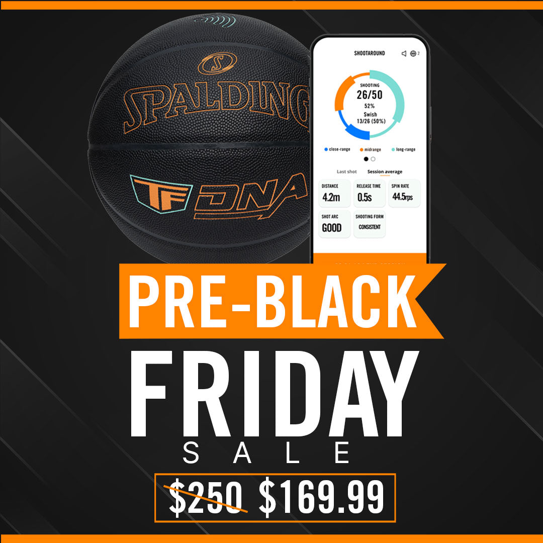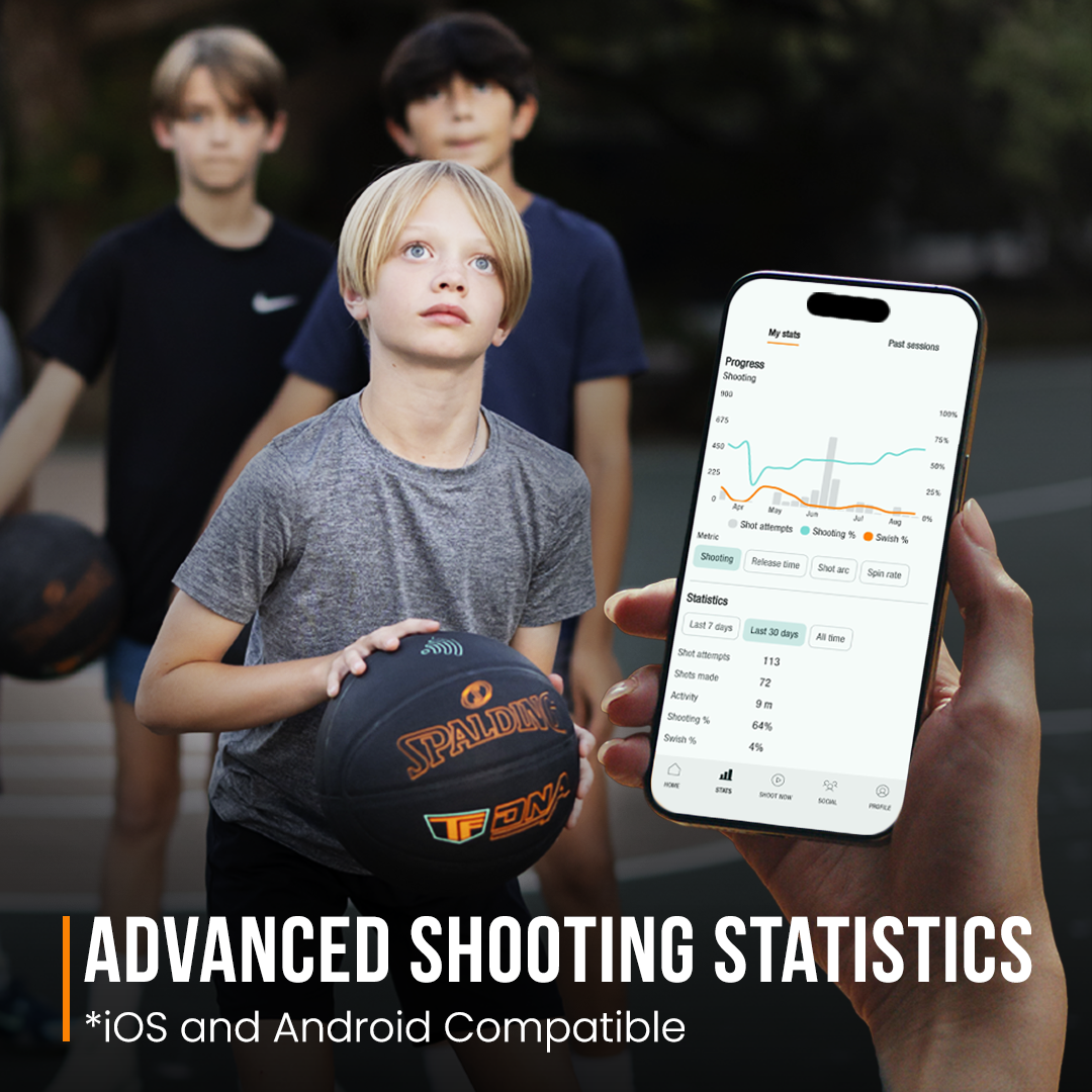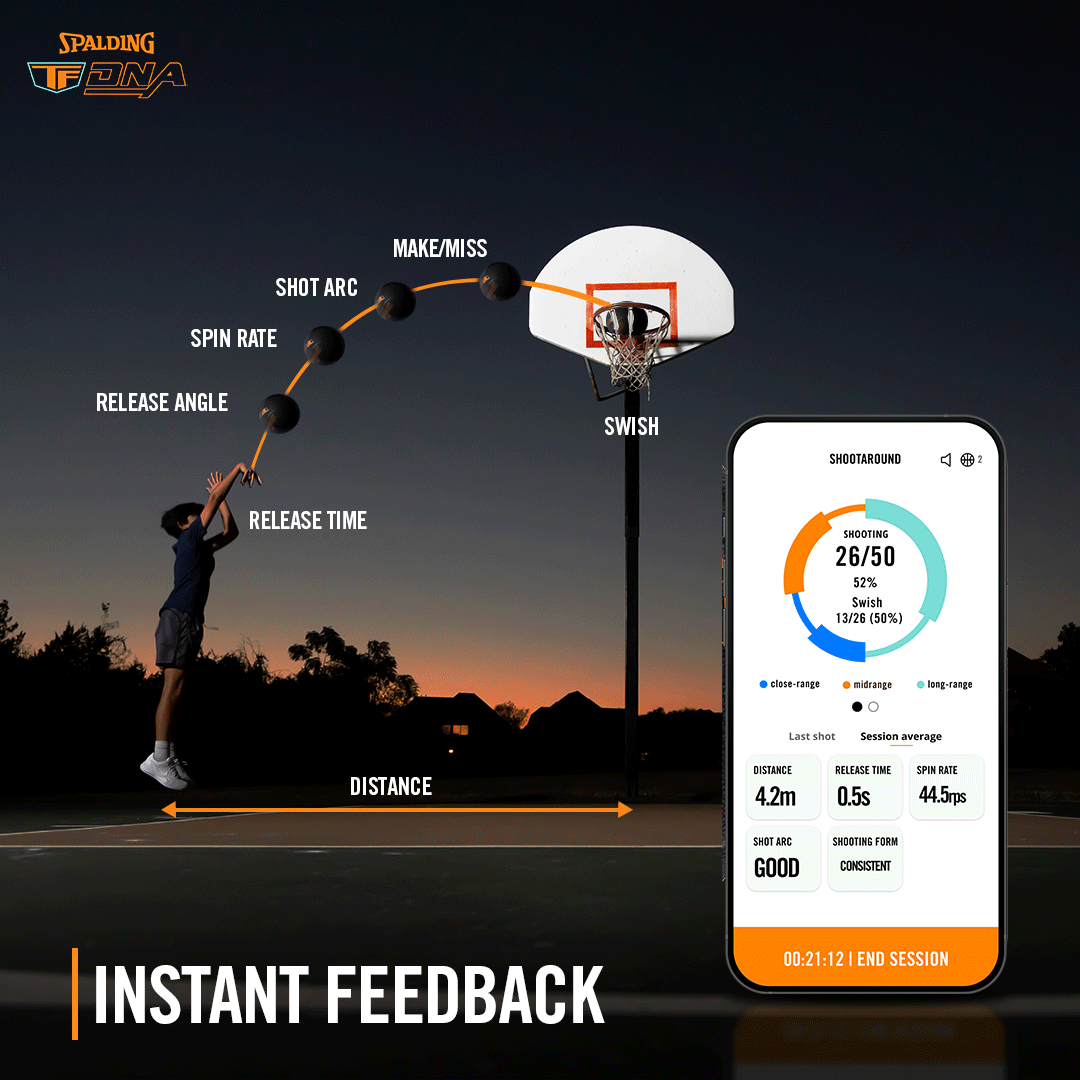 The TF DNA pairs Spalding’s premium game-ball feel with a 9D sensor and an AI-powered app that tracks your release time, shot arc, spin rate, and accuracy — giving you real-time feedback to get better every session.